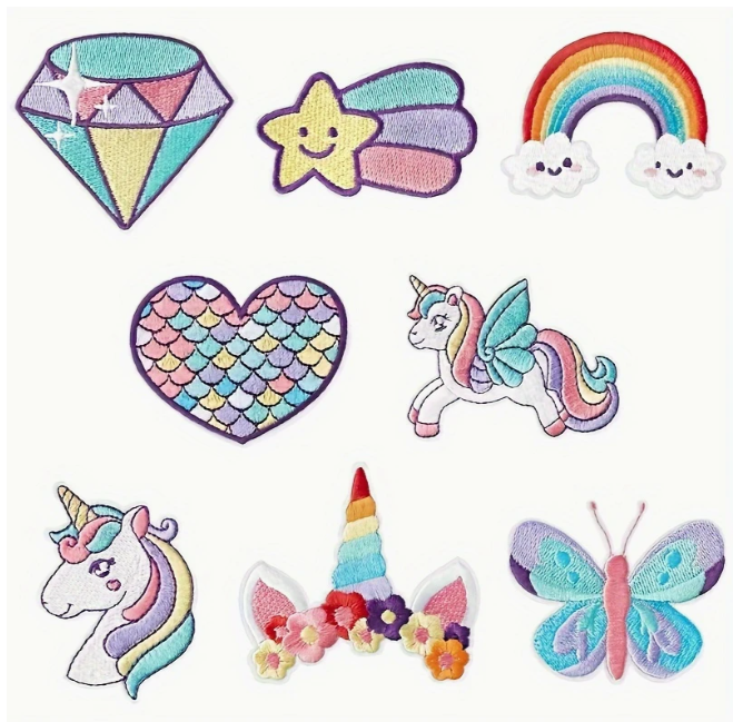strijkembleem 8 stuks unicorn regenboog vlinder